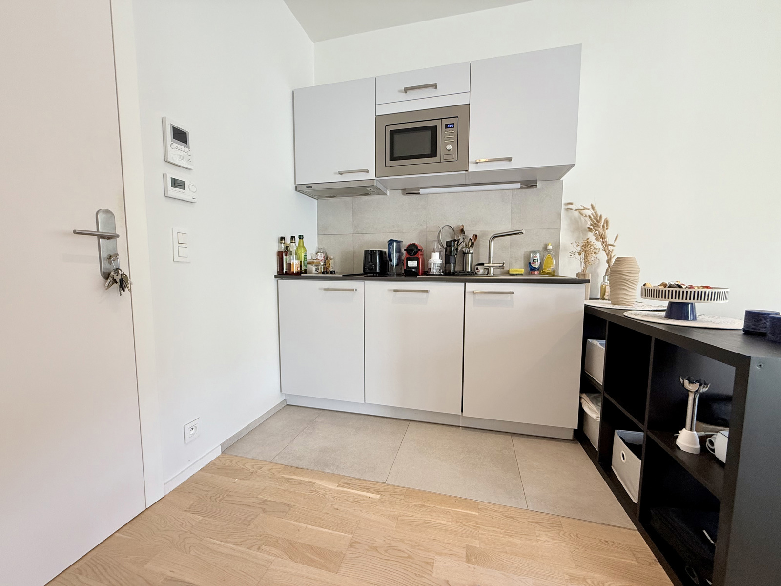Il se compose d’une pièce de vie avec cuisine équipée (taque, hotte, frigo, four combiné, lave-vaisselle), d’une salle de douche avec lavabo et WC, ainsi que d’une petite terrasse orientée Sud-Est (côté rue). Les grandes baies vitrées offrent une belle luminosité naturelle.
